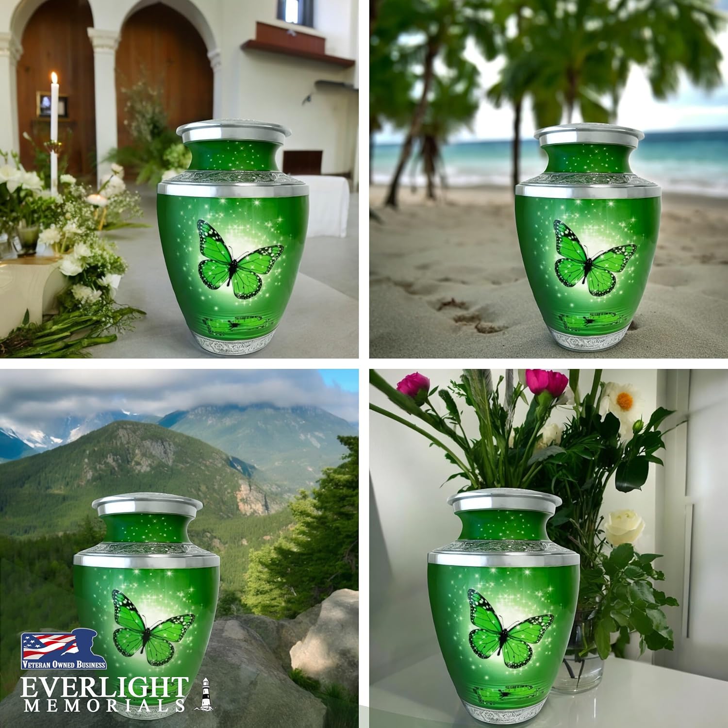 Green Butterfly Cremation Urn for Ashes, Large with Velvet Bag