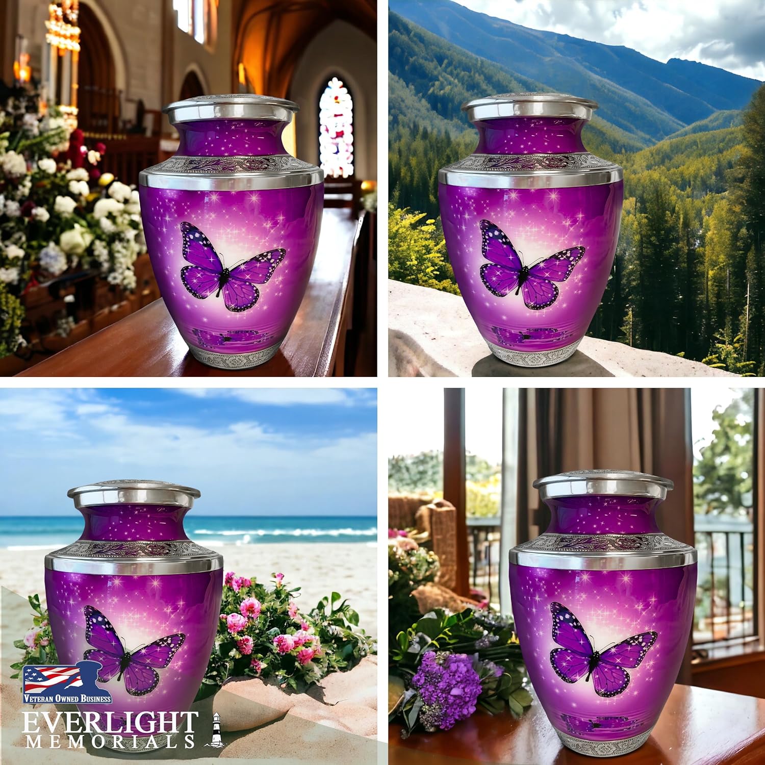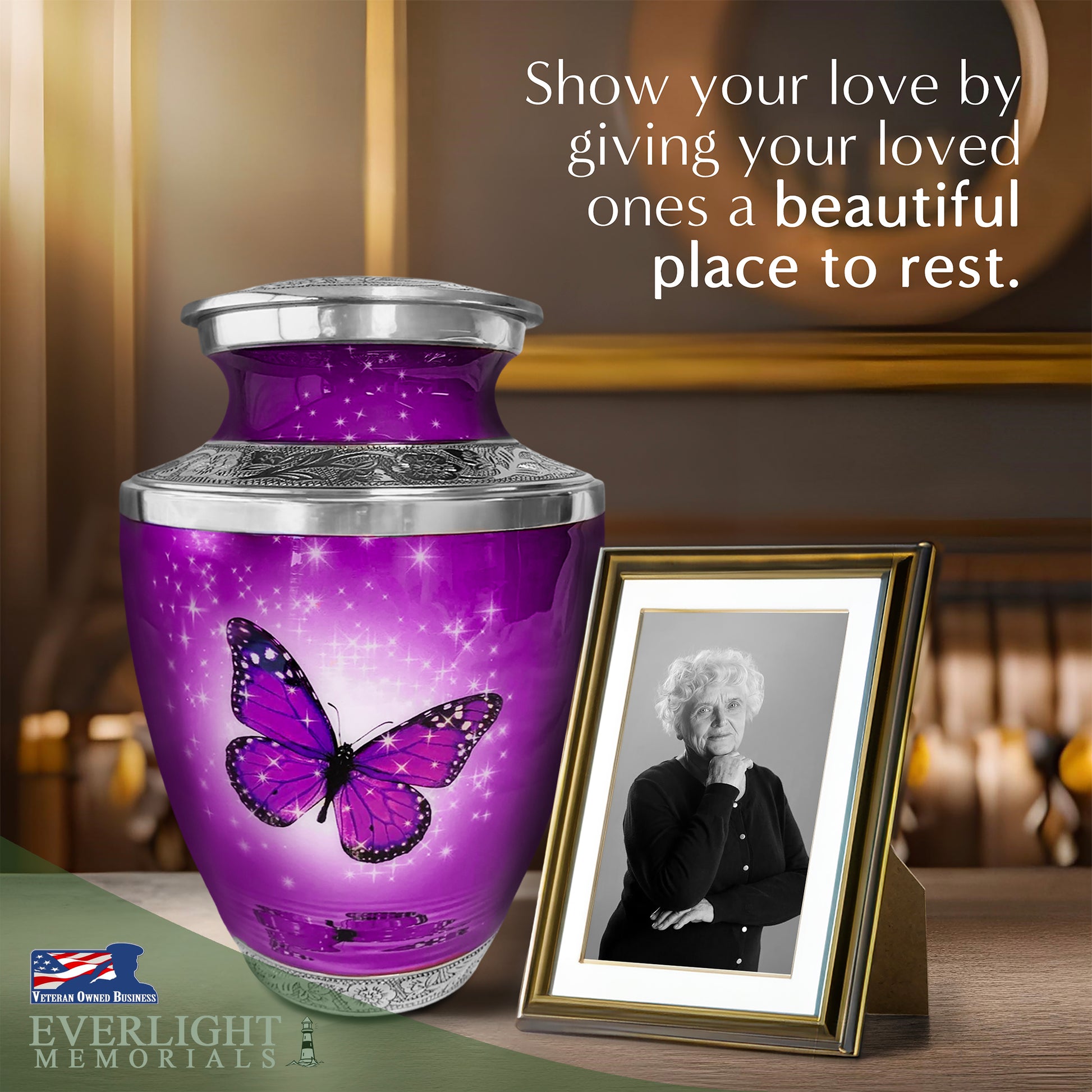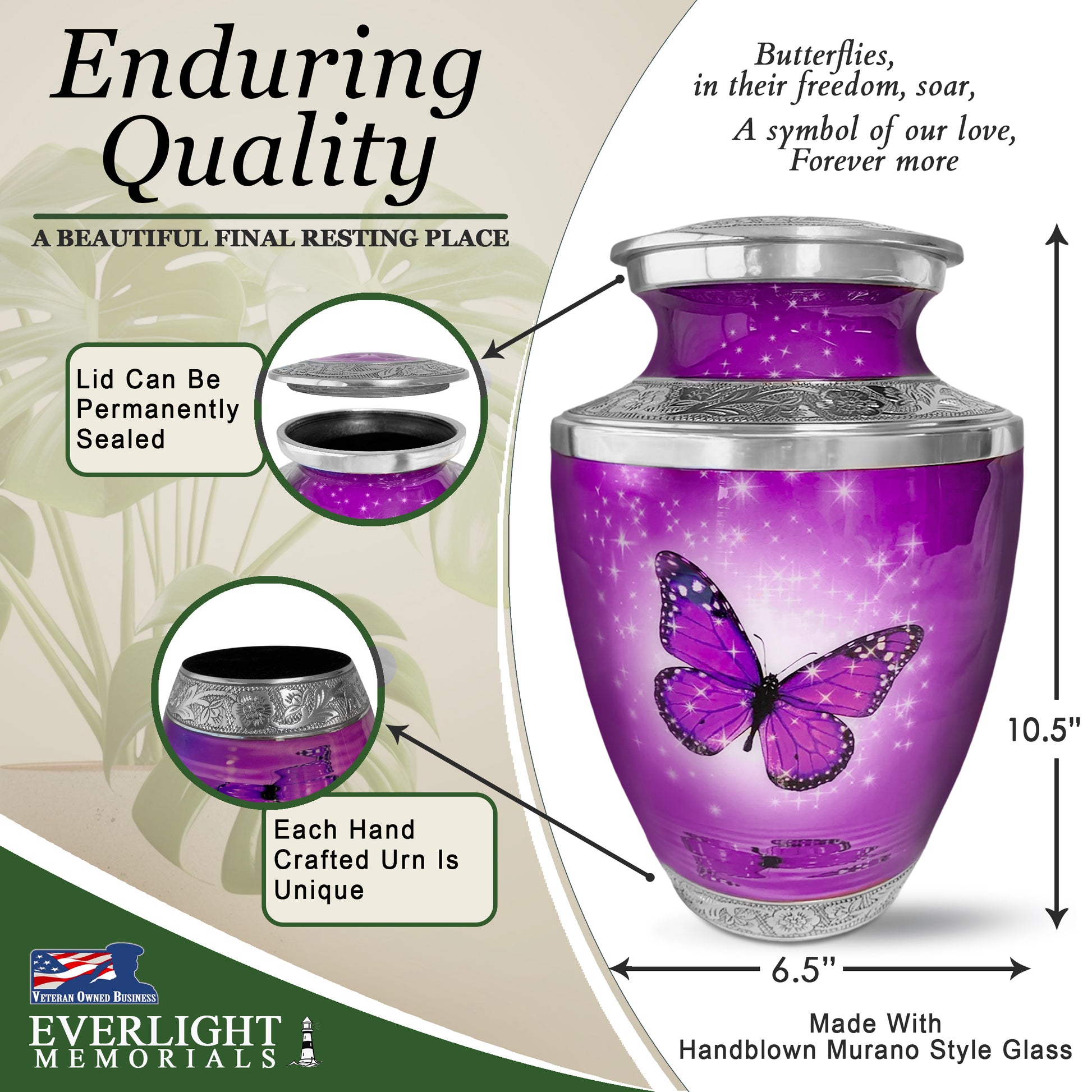 Purple Butterfly Cremation Urn for Human Ashes, Large with Velvet Bag