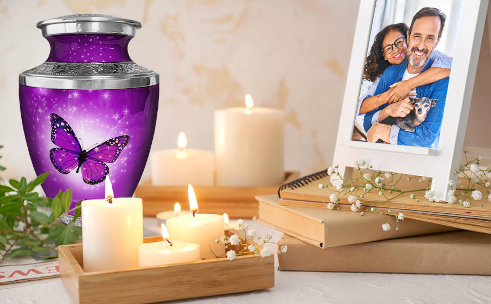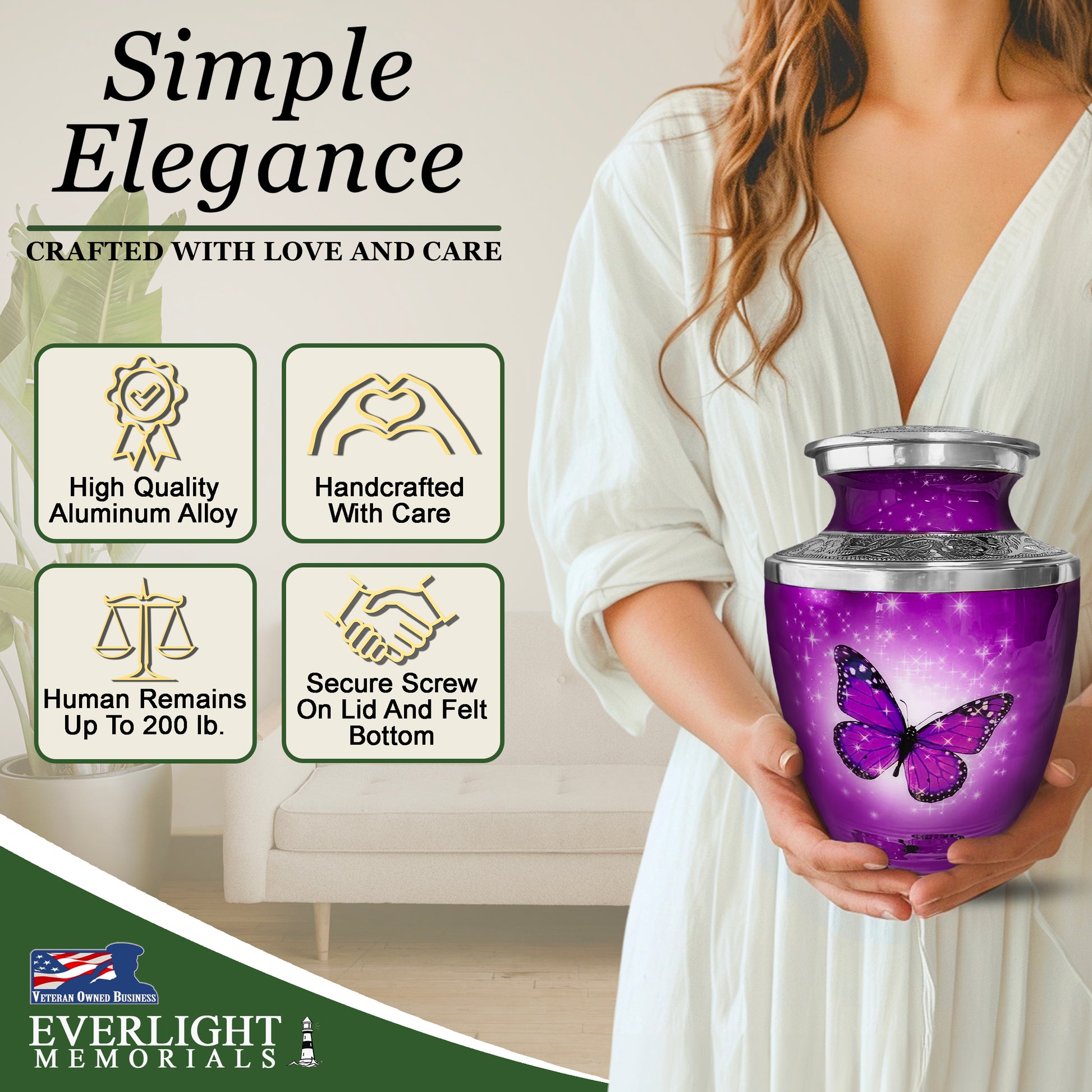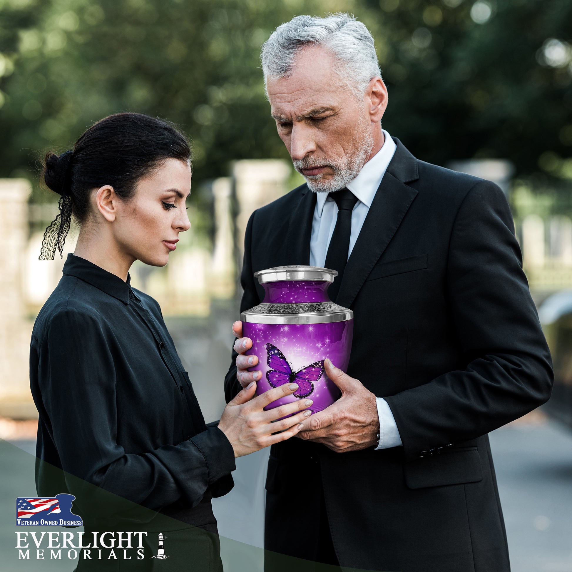 Purple Butterfly Cremation Urn for Human Ashes, Large with Velvet Bag