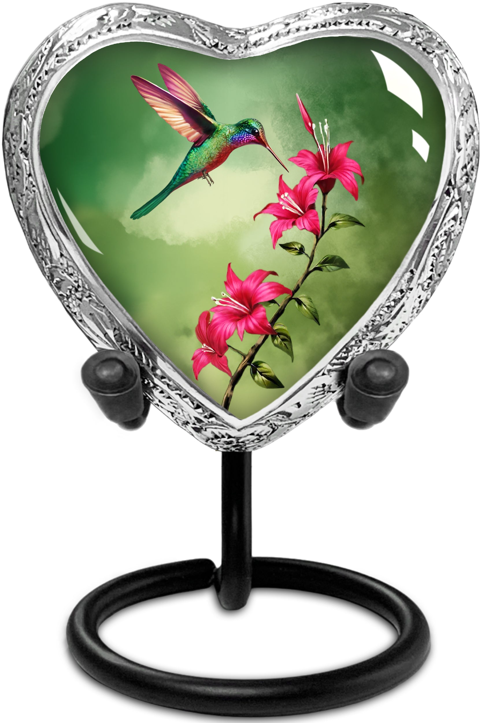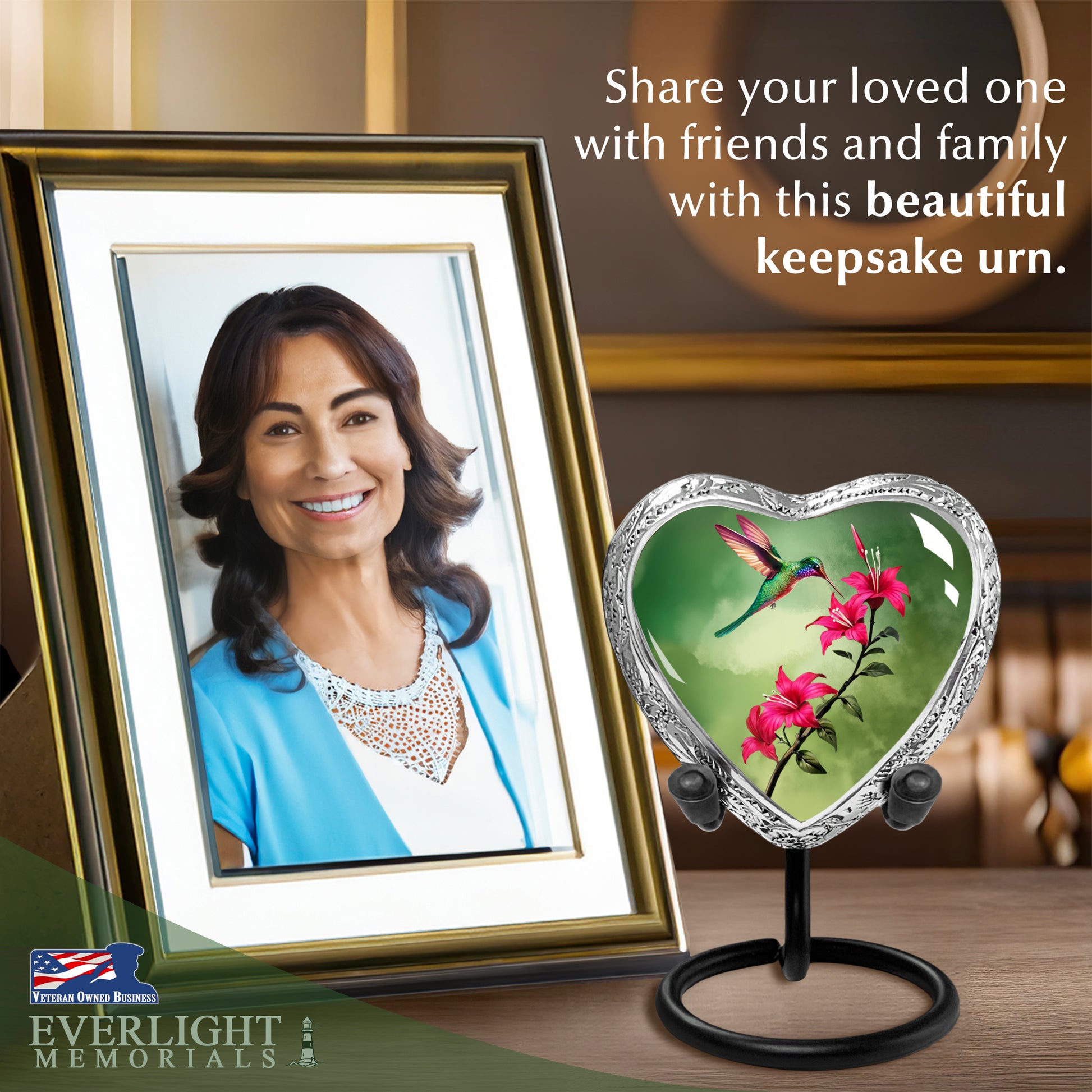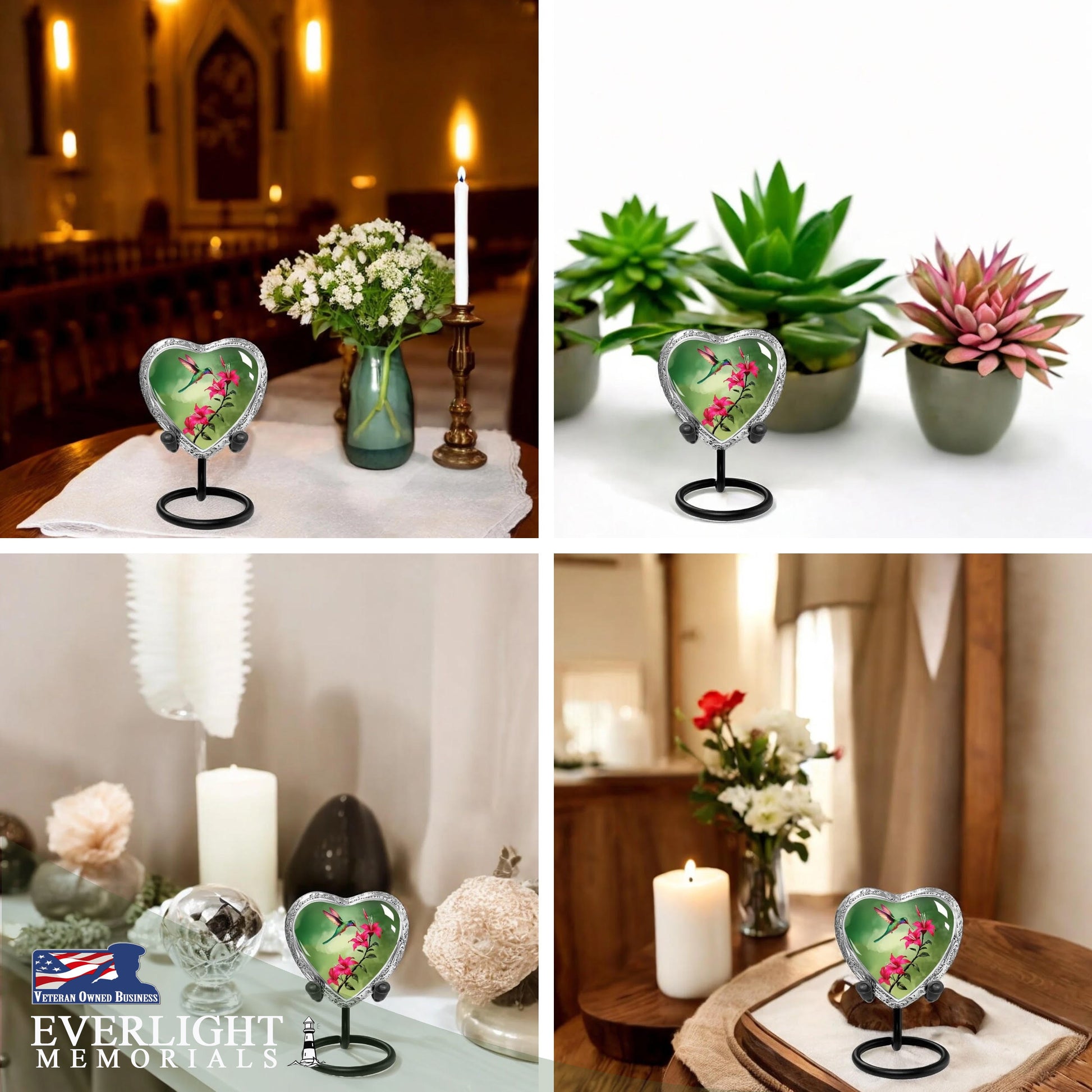 Heart Shaped Small Keepsake Cremation Urns for Human Ashes - Green Hummingbird